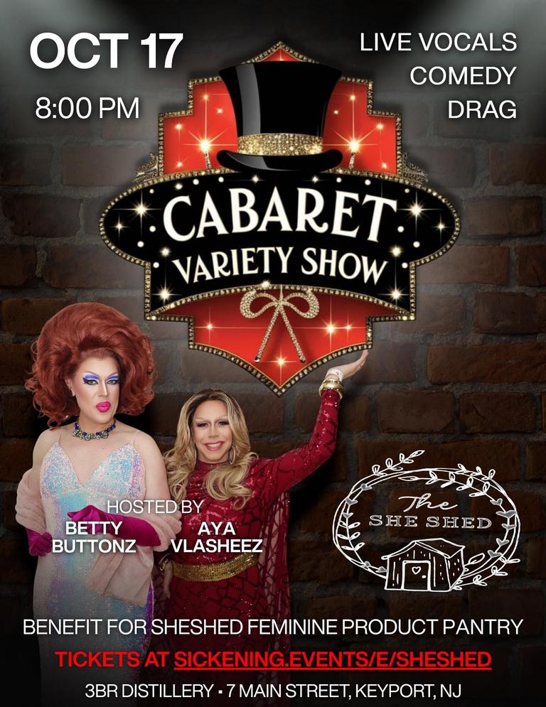 On October 17th Aya and I are taking Keyport by storm, hosting a cabaret at 3BR Distillery, an incredible venue with fabulous cocktails made from their very own vodka and other products! It’s a fundraiser for the “She Shed,” a local organization that provides free women’s health and menstrual products to folks in need across Monmouth County. “Period Poverty” is a thing which should not exist. We can’t wait to put on our campy cabaret to support such a good local cause.