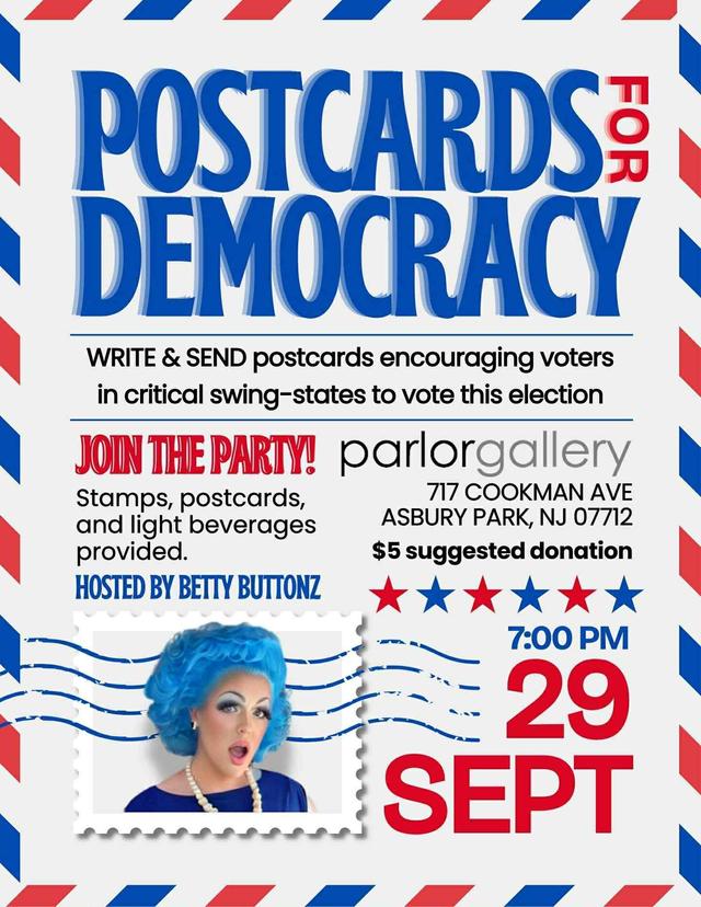 You’ll be at Asbury Park’s Parlor Gallery for a very special event on September 29th: “Postcards for Democracy.” There, you’re going to be presiding over a campaign of postcard writing to critical voters encouraging them to vote a certain way in the next election.