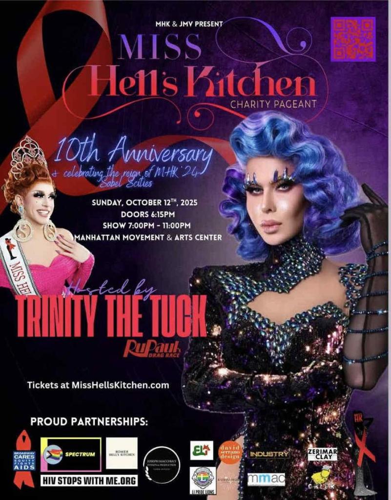 Then Sunday the 12th, it’s the main event: Miss Hells Kitchen at the Manhattan Movement Arts Center, hosted by the great Trinity the Tuck and her brand new face! For those not in know, Miss HK is more than just a fabulously opulent pageant: it benefits Cycle for the Cause, which raises funds towards HIV prevention, treatment and awareness.