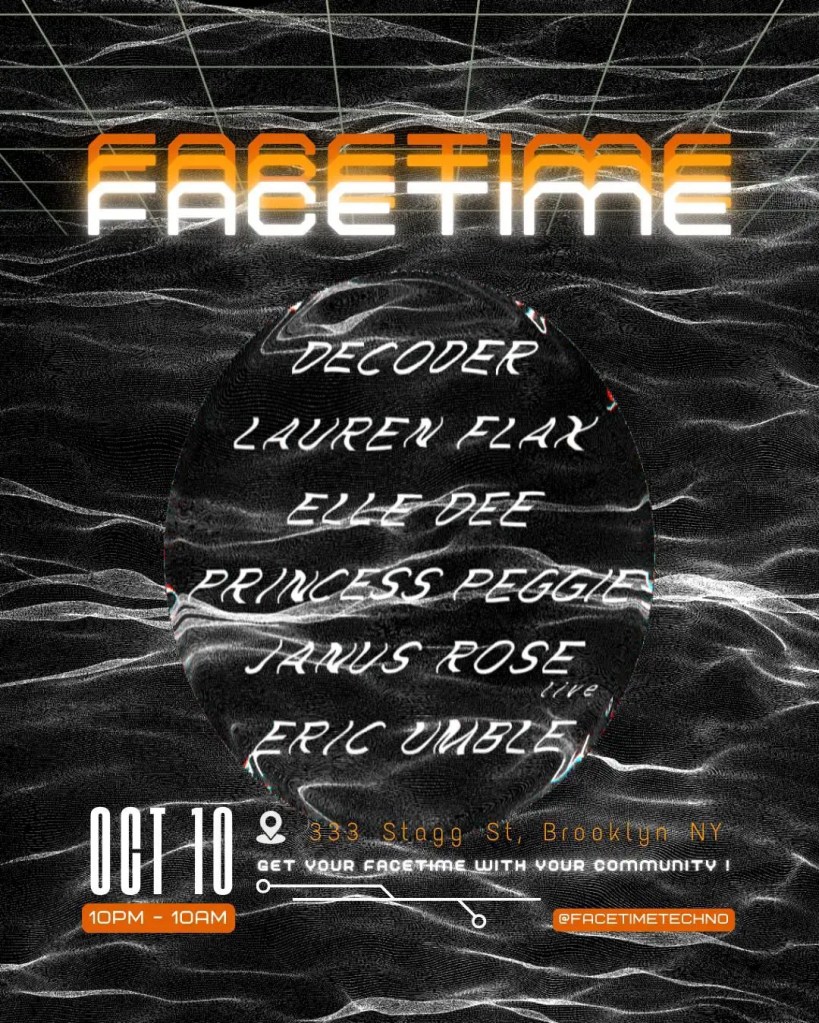 Oh my gosh! I’m super excited for next Friday’s party. It’s our first 12-hour “FACETIME,” so I’m interested to see how the energy flows throughout the night / morning. We have an incredible lineup of artists that I’m honored to work with. I often open my own party (I love opening and helping to set the tone), and that is also the case on the 10th. “FACETIME” strives to articulate the sound of techno in New York City as expressed by local and regional artists who are active here, and our party on the 10th will do just that. I absolutely love the space, and I’m excited to see how “FACETIME” feels there. Entry is also free before 12am, with all other tickets under $30, for folks who are looking for a high-quality DIY queer techno party that doesn’t break the bank.