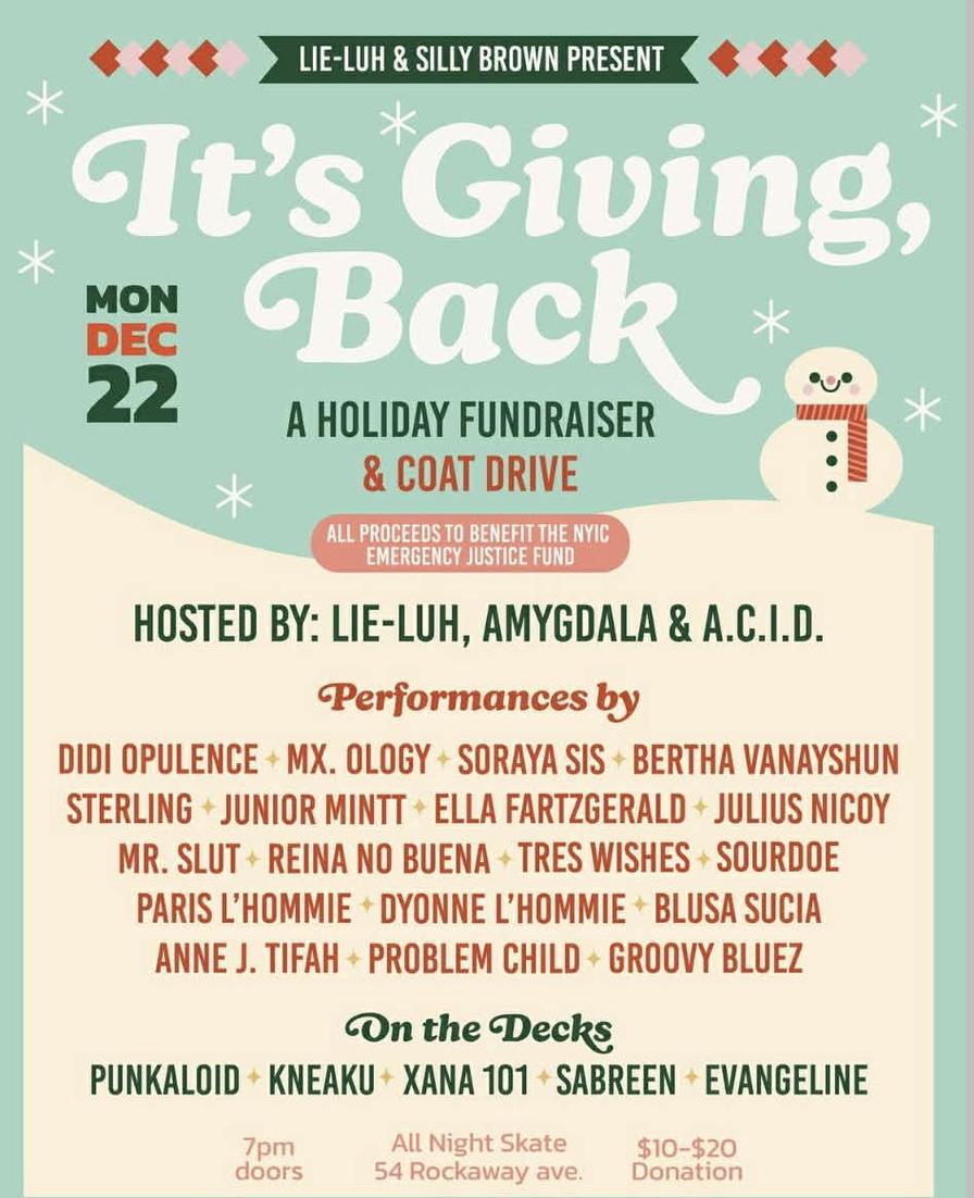 - ALL NIGHT SKATE: “It’s Giving, Back” feat. Lie-Luh, Amygdala & A.C.I.D. with DiDi Opulence, Mx. Ology, Soraya Sis, Bertha Vanayshun, Sterling, Junior Mintt, Ella Fartzgerald, Julius Nicoy, Mr. Slut, Reina NoBuena, Tres Wishes, Sourdoe, Paris L’Hommie, Dyonne L’Hommie, Blusa Sucia, Anne J. Tifah, Problem Child & Groovy Bluez (7pm)