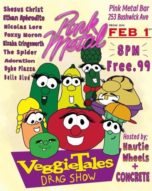 You were supposed to have another show this past weekend, but due to the snowstorm it got bumped to this coming Sunday. The good news is, we get to talk about it here now! You and Concrete are going to host a VeggieTales drag show at Pink Metal on February 1st! What can you tell us about what’s gonna go down at this show, and were you a VeggieTales fan growing up?
