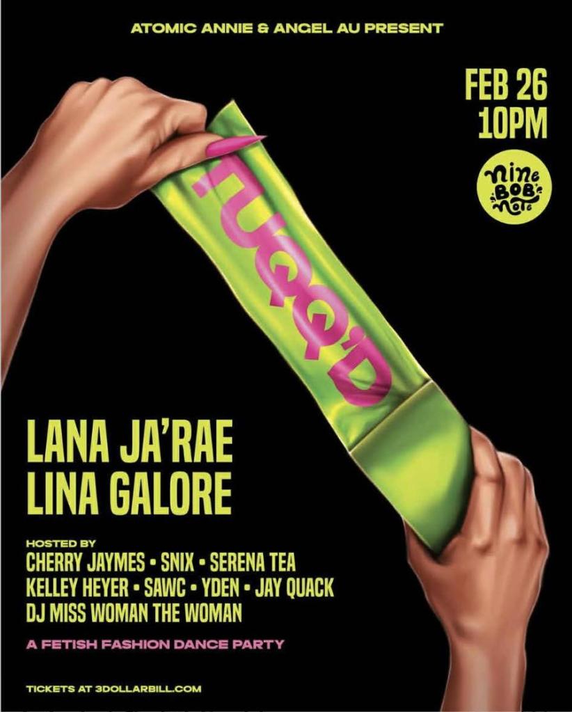 Then on February 26th, you’re part of the lineup for Angel Au and Atomic Annie’s “TUQQ’D: A Fetish Fashion Party” at 9 Bob Note featuring Lana Ja’Rae and Drag Race Italia Season 3 winner Lina Galore!