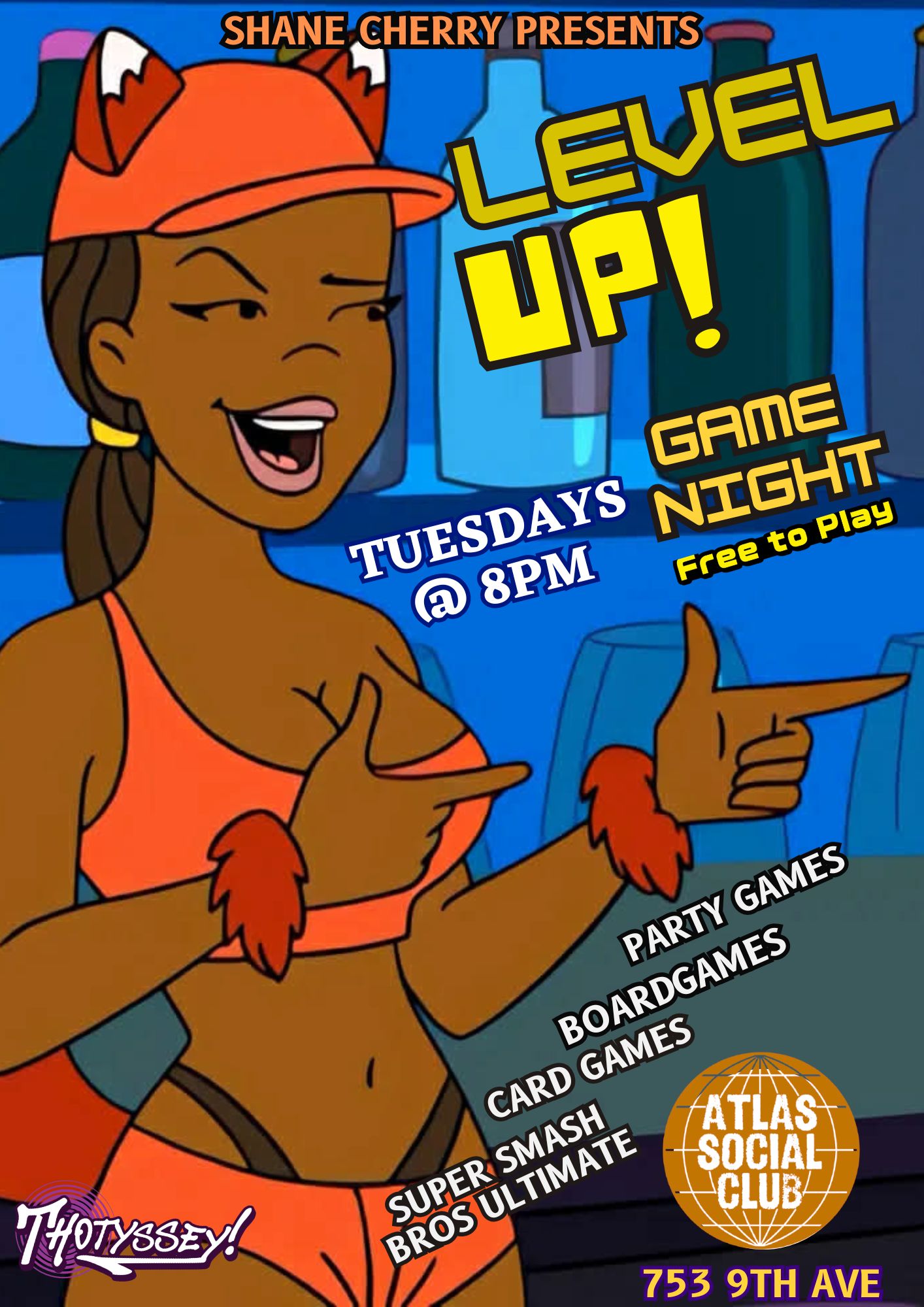- ATLAS SOCIAL CLUB: “Level Up” geeky name night hosted by Thotyssey & Shane Cherry (8pm)