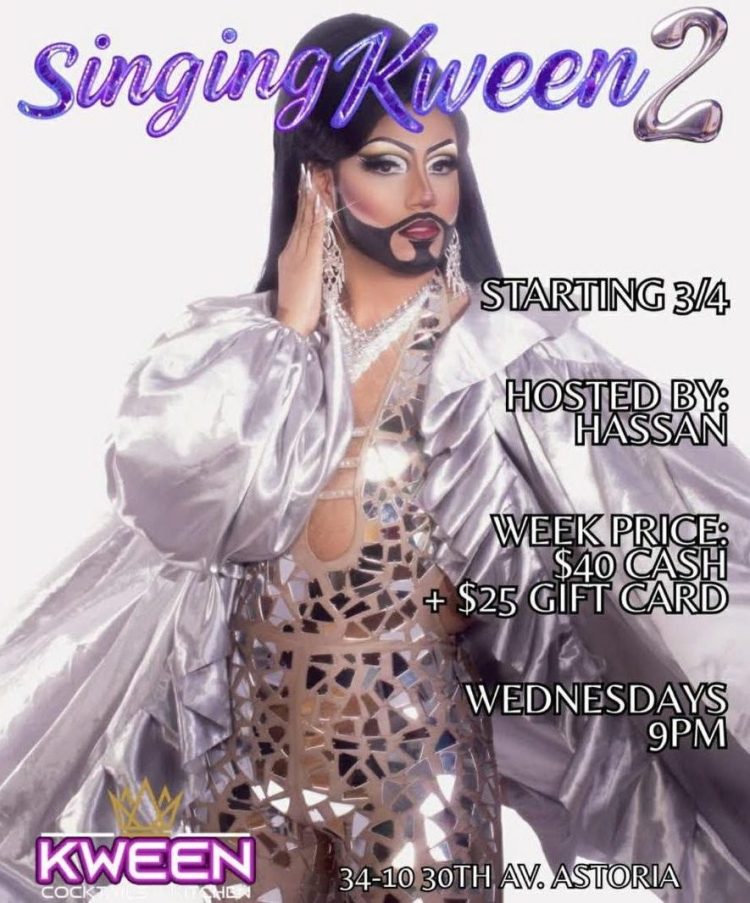 It’s preliminary rounds, and then the finale has the winner of each round compete in a smackdown for the crown! I am so excited to do this because it really brings in the best singers (mostly from the Astoria area), and brings the community together. I can’t wait to see the passion that comes with competition, from a judging standpoint! A huge shoutout to [Kween bar staffer] Sergio for his amazing work in helping me produce this competition. I want to see more drag performers go out there and Sing, Kween!