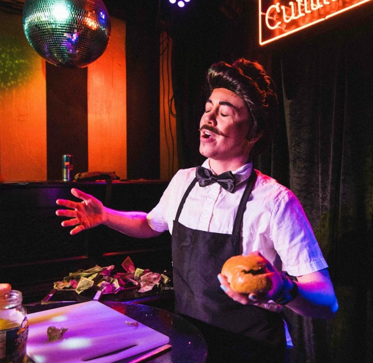 Then one day about four years ago, I was blasting music and dancing around my kitchen while curating a sandwich (as I am wont to do). When the sandwich (a masterpiece) was completed, I shouted “the sandwich artist strikes again” and urgently summoned my roommates to try it. This series of events occurred frequently in that apartment… but for some reason that day, I visualized myself doing the same thing on stage, and the concept of Beau Dega crystallized. I knew who he was, I just had to bring him to life.