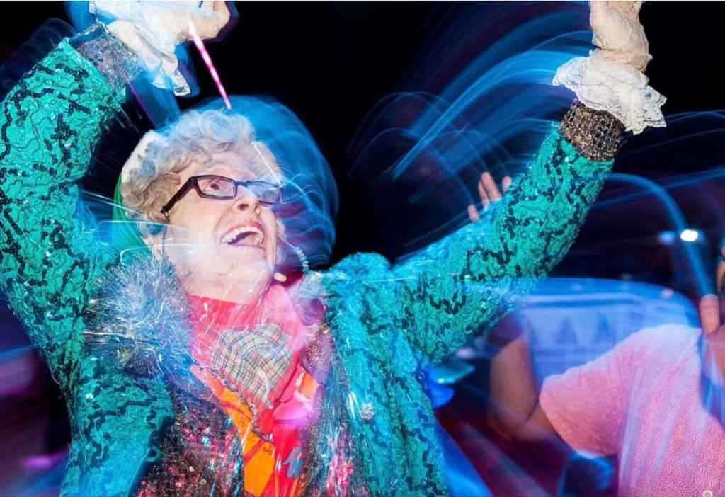 Fantasy Grandma: Sequins or nothin’! Sometimes nothing! I call that “old face young body.” Trademarked! I sing songs to glorify aging queerly.