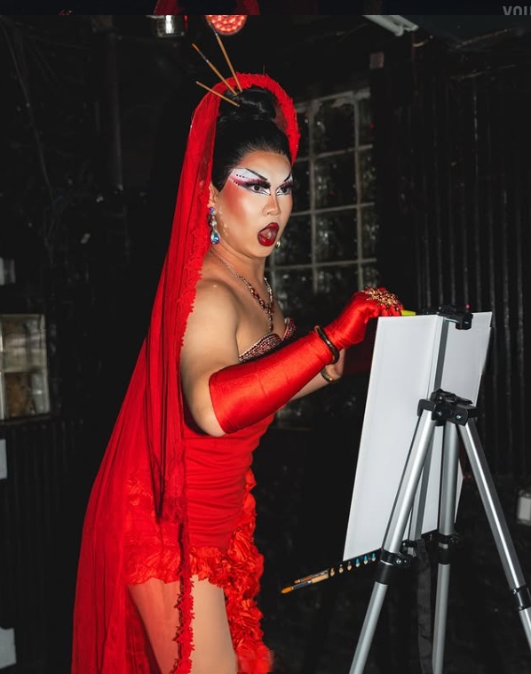 OMG, thank you so much for the kind words! I’d never done that number before, and I was like, “okay now or never. I gotta try this idea out that I’ve had in my head for a while, and what better spot then ay my Metro debut at Queer Talent Show?” It’s all about practice and timing, I have like three or four practice portraits I’ve done before debuting that number. It takes practice and time to make sure a number like that can be done in the time, and it’s also about figuring out what reads best for the audience. I did a couple full body paintings while practicing, but decided on a more stylized self portrait instead– since that’s easier for a group of probably drunk people to read while also being faster and easier in a number to do. It’s about give and take, lots to consider!