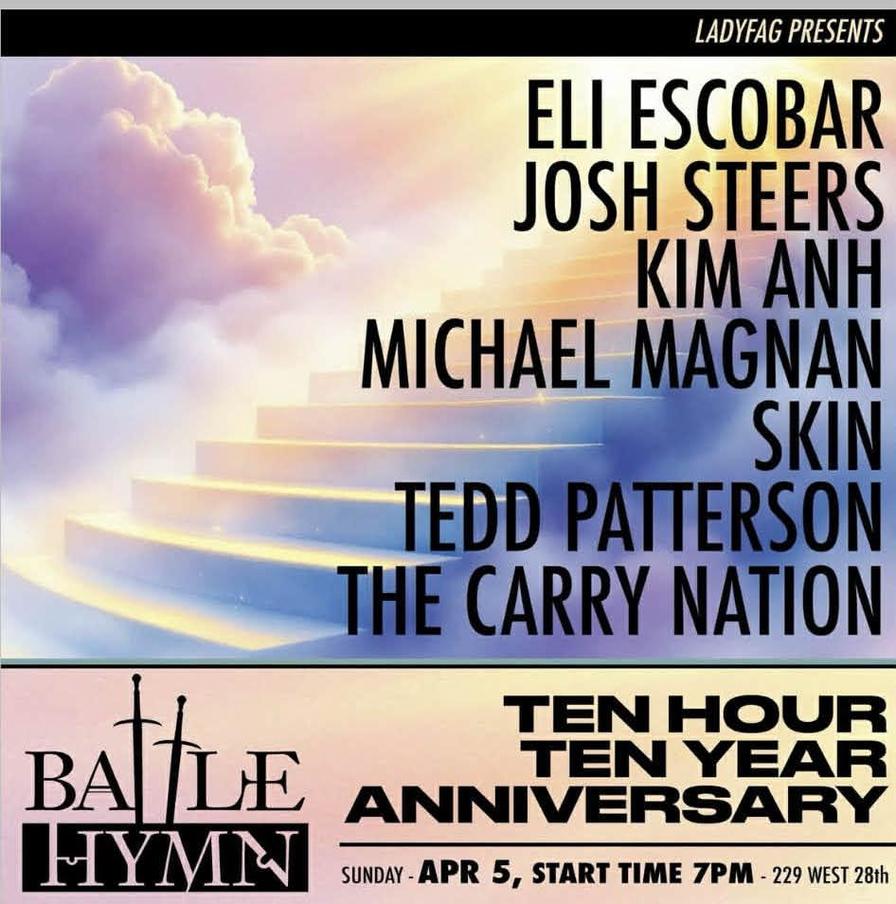 In the meantime, the flagship version of Battle Hymn at it’s Chelsea location Rumi will celebrate it’s 10th anniversary with a whopping 10 hour soiree on Easter Sunday! There’s an epic lineup of longtime Ladyfag collaborators doing sets in the booth, including yourself! What do you think it is about Battle Hymn that has not only made it so enduring, but more popular than ever?