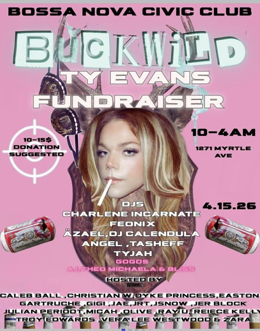 - BOSSA NOVA CIVIC CLUB: “Buckwild” benefit for Ty Evans feat. DJs Charlene, Feonix, Azael, Calendula, Angel, Tasheff & Tyjah (10pm)